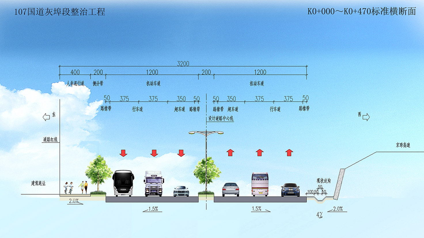 項目規(guī)模:城市主干道,設(shè)計速度50km/h,路寬60m,總長3.6Km。
