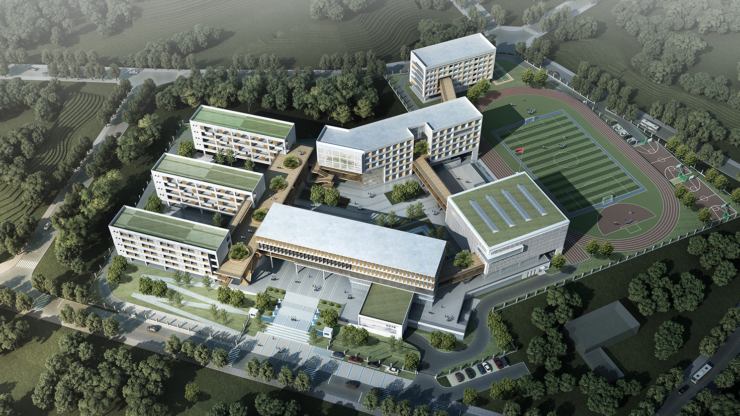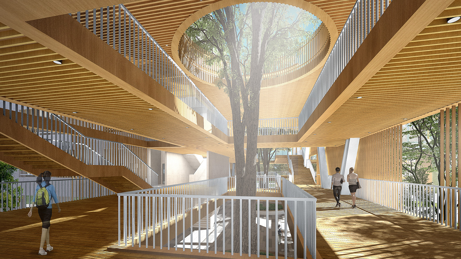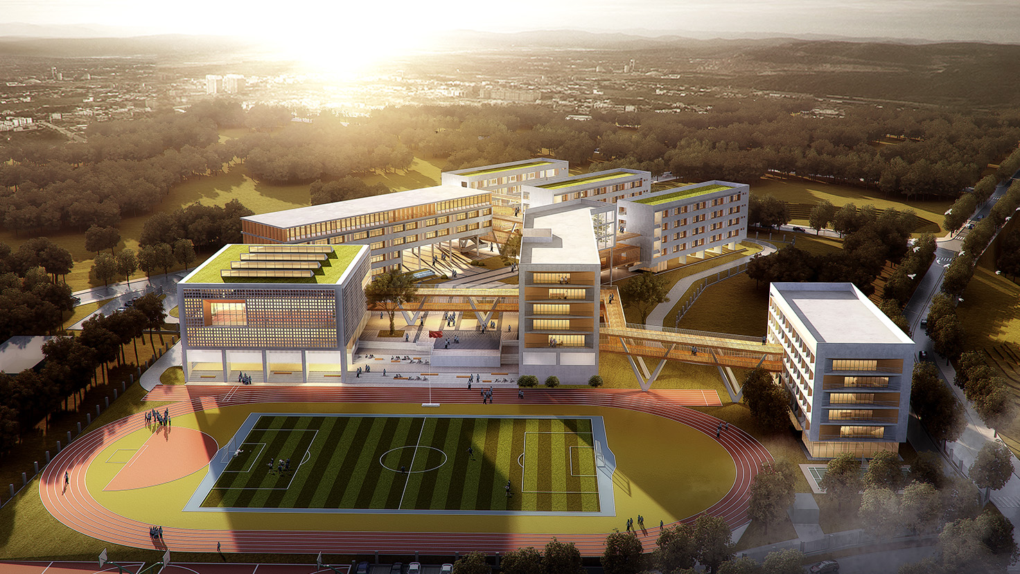 設(shè)計(jì)背景:楊昌濟(jì),后世稱“板倉先生”,一生致力于教書育人,培養(yǎng)出毛澤東、蔡和森等一批國家棟梁之材。其作聯(lián)“自閉桃源稱太古,欲栽大木柱長天”正是其一生理想。 本次設(shè)計(jì)由板倉先生的理想出發(fā),“欲栽大木柱長天”,“木”是中國教育的開始,至圣先師孔子便是在樹下為門下弟子傳道授業(yè)。讓樹木在建筑中生長,打造板倉先生理想中的教書育人的“桃源”。 由于學(xué)校各建筑功能的豐富性以及獨(dú)特性,我們將建筑進(jìn)行人為的動(dòng)靜分區(qū)以保證其良好的教學(xué)秩序,但是各功能區(qū)通過連廊相連接,圍合成多變的組團(tuán)空間,不同尺度的內(nèi)庭院相串聯(lián),營造出安靜、舒適的教學(xué)與活動(dòng)環(huán)境。